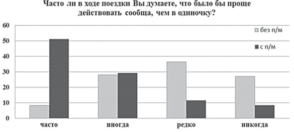 Рис.8. Распределение ответов на вопрос: «Часто ли в ходе поездки Вы думаете, что было бы проще действовать сообща, чем в одиночку?»