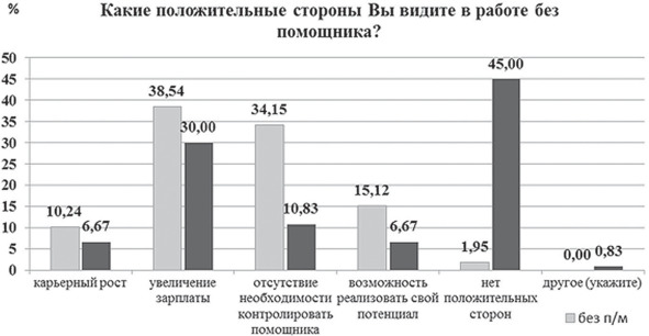 Положительные стороны, которые машинисты отмечают в возможности работы без помощника, также существенно отличаются в двух группах респондентов. Для тех машинистов, кто уже работает без помощника, основными становятся такие факторы, как увеличение заработной платы (38,5%) и отсутствие необходимости контролировать действия помощника (34,1%). В группе машинистов, работающих в составе локомотивной бригады, также отмечается внимание к перспективам увеличения заработной платы (30%), однако, многие участники этой группы считают, что положительных сторон в работе без помощника нет (45%).