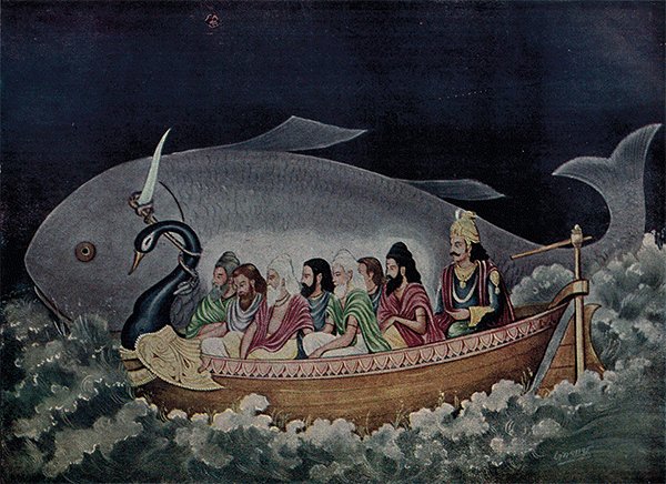 Рыба Матсья спасает семерых мудрецов (саптаришей) и Ману от Великого потопа