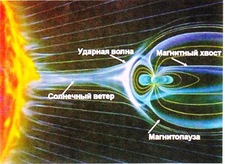Эта «булава» на расстояниях 13-17 Rз (земных радиусов), от центра Земли, своей «головой»– магнитронными силовыми линиями магнитного поля Земли, встречает силовые линии секторов галактического и солнечного магнитных полей, вдоль которых движутся потоки плазмы о-т атомов, нуклонов, электронов и магнитронов, с очень высокими энергиями, деформируясь, с утренней и вечерней стороны, до 30 Rз, а с ночной – «хвостовая часть «булавы» простирается на расстояние более 1000 Rз[27], сжимаясь, тупо препятствует проникновению, затормаживает их, заставляя плоти последних, обтекать свою поверхность, защищая, тем самым, от смертельных излучений Космоса, биосферу нашей Планеты.
