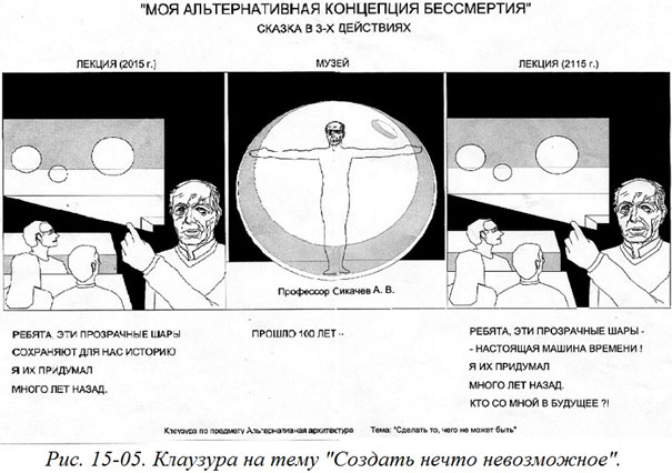 В центральной части триптиха шар, внутри которого я – явный ироничный намек. А в третьей части триптиха снова я через 100 лет, снова читаю лекцию со словами: «Ребята! Эти прозрачные шары – настоящая машина времени! Я их придумал много лет назад. Кто со мной в будущее?!" В результате тема невозможности была этим студентом органично соединена с темой моих лекций и даже в каком-то смысле с моей психологией. К тому же с нескрываемой, но тактичной иронией в мой адрес.