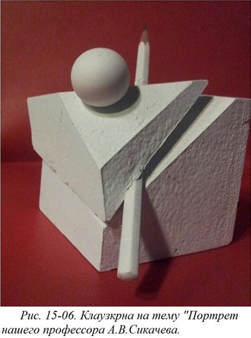 А в другой группе в другом учебном году я после своей заключительной лекции решил дать для клаузуры тему: «Создать нечто, что с Вашей точки зрения является моим портретом». Я полагал, что прослушав весь цикл лекций, в которых было немало и моих работ, они уже составили определенное мнение обо мне и как специалисте, и как человеке. Однако формулировка темы – сплошная двусмысленность – не спроектировать, а создать. Что подразумевается под этим «созданием» – графический лист, живописная картина, скульптура? А может быть можно написать симфонию или даже создать новые духи лучше Шанель, запах которых символизирует этого странного нашего профессора? Другими словами, каким языком выразить заданную тему? Но все подобные вопросы запретили задавать! Так что придется их решать самому. И прослушав курс лекций лучшие из студентов их так или иначе решили.