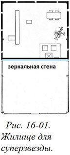 Но подлинной изюминкой проекта было то, что стена, разделяющая половины дома представляла собой со стороны прозрачной половины здания сплошное зеркало. И в этом был не просто художественно-декоративный смысл, а серьезный психологический эффект. Автор проекта рассуждал приблизительно так: Любая суперзвезда живет как бы двойной жизнью. Создается некий миф о ее личности, о ее жизни. Наряду с этим есть ее «настоящая» жизнь, зачастую совсем не похожая на миф, а то и противоположная ему. И такое положение устраивает всех. Миф охотно поддерживается самой суперзвездой. И развенчивать его она совсем не стремится. Скорей наоборот. Получается как бы два «Я» человека – «Я внутреннее» и «Я внешнее». Внутреннее – это представление о себе самом, о своих «истинных» потребностях, о своих «настоящих» мечтах. Внешнее – как нужно выглядеть со стороны.