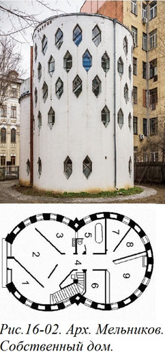 В историю архитектуры 20 века заслуженно вошел односемейный жилой дом архитектора Мельникова, спроектированный и построенный им в 1927–1929 годах в Москве для себя и своей семьи. В многочисленных публикациях, посвященных этому зданию подробно рассказывается, почему это произведение справедливо признано архитектурным шедевром мирового масштаба[16-4]. Но хочу отметить еще одну особенность этого замечательного произведения, особенность, на которую редко обращают внимание критики: он для себя делал абсолютно так же, как проектировал «для других». Композиционный объемно-пространственный прием в виде врезанных друг в друга цилиндров он впервые задумал для проекта клуба им. Зуева. А когда клуб стали строить по проекту другого архитектора, Мельников решил использовать такую композицию в своем доме. (Рис. 16–02).