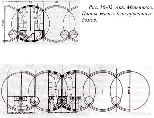 А затем снова полное слияние «Я внутреннего» и «Я внешнего» проявилось у этого мастера еще несколько раз. На основе аналогичной композиции Мельников разработал, блокированный дом, дом секционного типа и дом-коммуну. (Рис. 16–03).