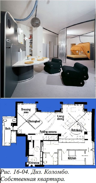 Это была квартира в довольно старом доме[16-6]. Дизайнер сделал не очень большую перепланировку. Бывшие жилые комнаты превращены им в единое пространство, в котором размещены два больших «жилых агрегата» – «Для дня» (Rotoliving) и «Для ночи» (Closingbed) (Рис. 16–04). Подобно своим далеким предшественницам «клозингбед» обеспечивала свой микроклимат, причем не просто физической изоляцией от остального помещения, но и с использованием активных технических средств, позволявших автоматически поддерживать внутри закрытия состав воздуха, влажность, даже запахи и ряд других параметров среды. Благодаря трансформациям жилое пространство постоянно оказывается максимально комфортным применительно к потребностям конкретного момента. Так Коломбо проектировал для всеобщего будущего. И для себя исключения не сделал. Яркий пример отсутствия раздвоения «Я».