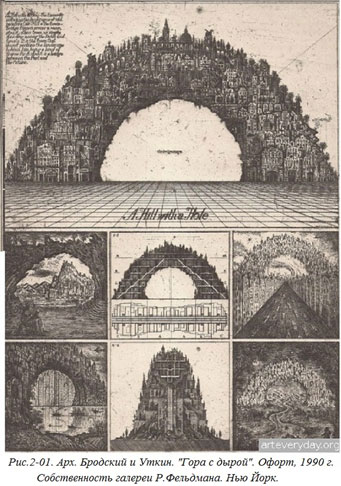 Строго говоря, это были вовсе не архитектурные проекты. Как отмечал впоследствии один из наших «бумажников», это были исключительно графические или живописные произведения, не претендовавшие на какую-либо реализацию. И совсем не из-за каких-то технических трудностей. Действительно, странно говорить о строительном осуществлении того, что изобразили Бродский и Уткин в своем великолепном офорте 1987 года под названием «Гора с дырой» (Рис. 2–01).