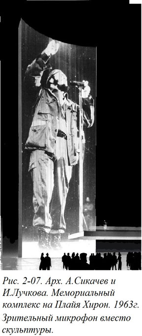 Но мы, вместо какого-либо монумента, обычного в подобных случаях, предложили своего рода "зрительный микрофон" в виде гигантского экрана за спиной выступающего[2-17]. Сейчас такие устройства уже широко применяются. Но тогда, в 1963 году, ничего подобного нигде в мире не было. Появились лишь первые публикации о проводимых экспериментах по разработке технических устройств подобного рода. Так что, мы «поторопились» лет на 20–25.