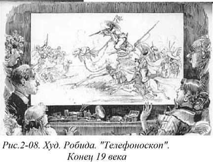 Конечно, лестно ощущать, что смог опередить время на два десятка лет. Однако впоследствии оказалось, что от преувеличения этого собственного достижения лучше воздержаться. Выяснилось, что еще намного раньше, за многие десятилетия до появления телевидения как такового, удивительный художник 19 века Альбер Робида не только предсказал появление подобного технического устройства, но и нарисовал его, причем настолько похоже на современные телевизоры, что возникает сумасшедшая мысль о реальной возможности путешествия в будущее (Рис. 2–08). Современники Робида воспринимали его рисунки лишь как карикатуры в газете[2-18]. И никому даже в голову не пришло, что это самый настоящий «дизайн в заначку», говоря современным языком. Этот и многие другие рисунки Робида подтверждают правомерность архитектурного и дизайнерского проектирования на неопределенно далекую перспективу.