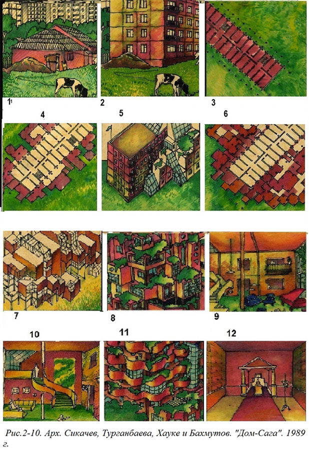 Что же касается «бумажной архитектуры» как «неархитектуры», то к этому жанру мне довелось приобщиться лишь однажды. В 1989 году, совместно с архитекторами А. Хауке, Л. Турганбаевой и Ю. Бахмутовым, я выполнил конкурсный проект, названный мной «Дом-Сага»[2-19].