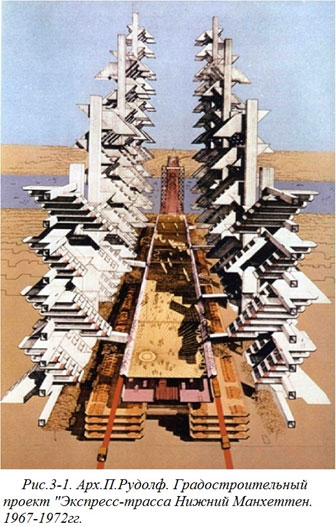 Большинство «архитектурных фантазий» носит градостроительный или даже глобальный характер. Архитекторы в основном разрабатывают самые общие вопросы расселения в масштабах целых районов, стран или даже всего земного шара. Очень популярна тема «Город будущего». Подавляющее большинство авторов предлагает различные варианты идеи некого супер-дома, сравнявшегося своими размерами с целым городом. Не избежали этой моды и мастера мирового уровня[3–1]. Так, в одном из проектов известного американского архитектора Пола Рудолфа композиция предложенного им дома-города напоминала гигантский небоскреб, положенный набок (или, если угодно, на спину). (Рис. 3–01).