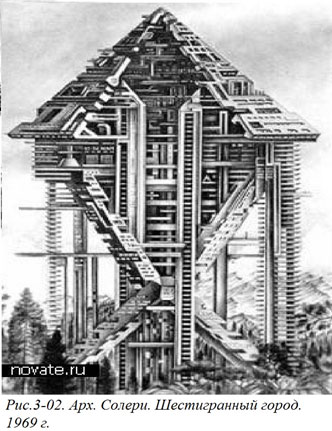Другой, не менее редкий из встречавшихся вариантов представлял собой супер-небоскреб в подлинном смысле слова, гигантское очень высокое здание, выросшее до размеров целого города. Именно таким был «Шестигранный небоскреб» выдающегося архитектора 20 века Паоло Солери[3–2]. Проект предназначался для города Скоттсдейл в США (Рис. 3–02).