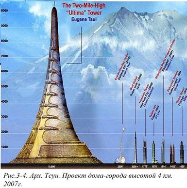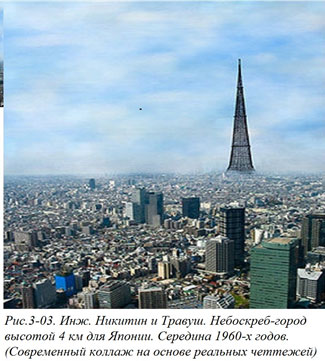А ведь будь этот гигант построен, он стал бы целым городом на 500 тыс. жителей. То, что проект Никитина и Травуша не решились реально строить, удивляться не приходится – слишком много возникало технических проблем. Удивительно другое – прошли десятилетия, и другая японская компания снова обратилась к идее похожего сверхдома. На этот раз под названием X-Seed 4000, а высотой в те же 4 км. Помимо квартир, способных вместить до 1 миллиона жителей предусматривались офисы, развлекательные учреждения и даже парки на разных этажах[3–4]. Правда, чтобы подняться на верхний этаж пришлось бы провести в специальном лифте целых 30 минут. (Рис. 3–04).