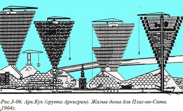 Подобные довольно экзотические «глобальные» архитектурные задумки при их детализации неизбежно подталкивают их авторов к отказу от привычных решений, способствуя порождению подлинных архитектурных мутаций. Но оказалось, что задумки объектов и не столь огромного масштаба способны породить не менее кардинальные творческие идеи. На уровне здания такой заслуживающей особого внимания архитектурно-дизайнерской мутацией стал проект лидера знаменитой английской архитектурной группы «Аркигрем» Питера Кука под названием «Плаг-ин-Сити»[3–5],[3–6],[3–7]. Название трудно перевести на русский язык. По смыслу это: «Город, построенный по принципу электрической вилки, вставляемой в розетку» (Рис. 3–05). В этой работе автор не просто рисовал какие-то диковинные формы архитектурных объектов. В «Плаг-ин-Сити» ясно просматриваются как минимум две «архитектурных мутации», позволяющие отнести данную работу к области архитектурной соляристики, то есть к предложениям, наглядно указывающим реальные пути движения к будущему. Первая – это расчленение архитектурного сооружения на две относительно автономные части – несущую конструкцию и несомое на ней наполнение. А вторая – использование в качестве несомых элементов неких объемных блоков-капсул. При этом капсулы предлагалось делать заменяемыми, для чего Кук нарисовал наверху домов своего «проекта» строительные башенные краны, которые по его замыслу должны там оставаться на весь срок эксплуатации здания. В результате краны он превратил из атрибута строительного процесса в элемент образа здания, со всеми вытекающими из этого следствиями архитектурного характера. (Рис. 3–06).