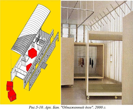 С этой точки зрения судьба идеи функциональной «комнаты в комнате» относительно благополучная. За прошедшие полвека она хотя и не получила массового распространения, но все же можно встретить отдельные примеры использования данной идеи в реальной практике архитектуры и дизайна. Так в 2000 году в Японии была построена по проекту архитектора Ш. Бана вилла, названная «Обнаженный Дом» (Рис. 5–17).