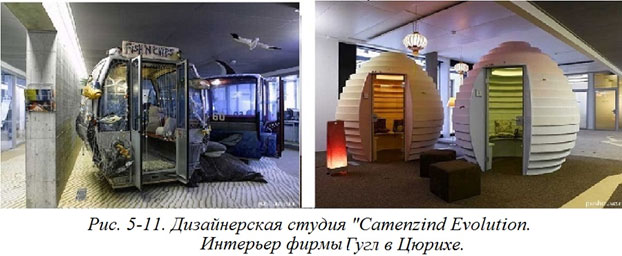 Это уже не проекты на бумаге и даже не выставочные образцы. Это реальная архитектура, в которой живут реальные люди. Конечно, японский образ жизни заметно сказался на внешнем облике элементов интерьера. Но данный пример наглядно показывает, что идея, казавшаяся фантастической, начинает входить в повседневную жизнь. Причем не только в жилище. Довольно большое пространство (около 12 000 м2) офиса фирмы Гугл в Цюрихе скомпоновано с максимальным использованием идеи «комнаты в комнате» (Рис. 5–11).