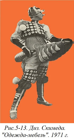 В те же годы появилась еще более радикальная дизайнерская мутация, развивающая фактически ту же тему. Дизайнер Р. Скимеда продемонстрировал одежду, начинающую в некоторой степени сливаться даже с мебелью (Рис. 5–13).