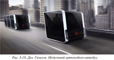 Несколько видоизмененный вариант той же идеи предложил итальянский дизайнер Томмазо Гичелли. Это модульный автобус, который составляется из нескольких персональных мобильных ячеек (Рис. 5–18). Объединение и разъединение модулей будет производиться также в автоматическом режиме. Когда модули будут соединены, внутри автобуса будет организовано «общее пространство». Предполагается, что в некоторых модулях будут располагаться магазины или кафе. Двигаясь по шоссе, они смогут подключаться к уже сгруппированным в автобусы модулям.[5-7]