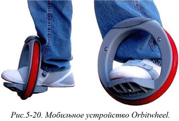 Можно привести еще целый ряд похожих разработок последних лет. Но большинству из них присущ один общий недостаток – в них довольно отчетливо проскальзывает призрак сегодняшнего автомобиля. То есть это всё тот же пресловутый принцип создания самолета путем приделывания крыльев к карете. Поэтому более интересны разработки, более решительно отходящие от сегодняшних стереотипов. Скажем, что-то интересное может со временем вырасти при дальнейшей эволюции уже поступивших в продажу и набирающих популярность Orbitwheel.[5-9] Это гибрид скейта и роликовых коньков – два довольно больших колеса по одному на каждую ногу. Колеса надеваются прямо на ступни и предоставляют большую свободу движений, трюков и маневров (Рис. 5–20)