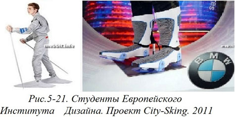 Так, проект City-Sking представляет собой комплект из лыж для передвижения по асфальту и специального костюма. В комплект также входят обувь с шарикоподшипниками и «маска», являющаяся полупрозрачным дисплеем – для отображения различной информации: от направления движения до ситуации на дороге (Рис. 5–21).