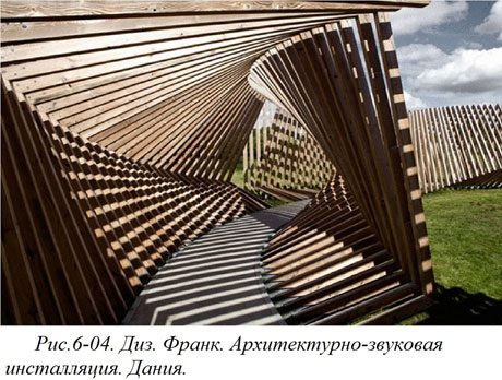 А немецкий дизайнер Т. Франк создал архитектурно-звуковую инсталляцию в Дании. Объект представлял собой пространственно сложную структуру из деревянных элементов, внутри которых скрыты микрофоны (Рис. 6–04).