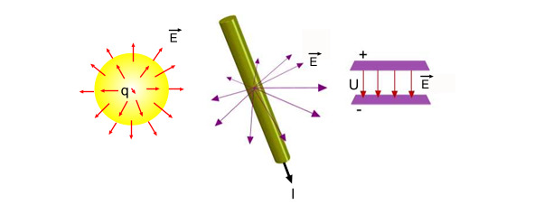 Рис. 1 Электрическое поле вокруг заряженного шара, проводника с током и между обкладками заряженного конденсатора