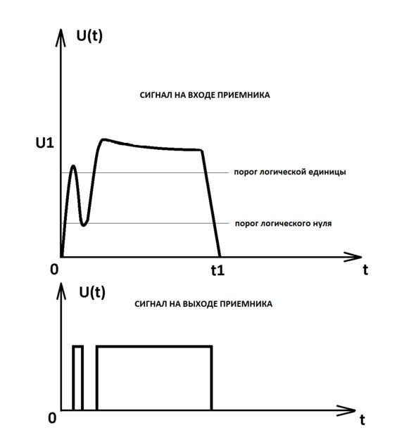 Если уровень сигнала на входе приемника превышает порог логической единицы, приемник распознает его как «единицу».