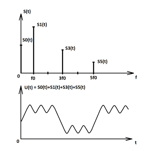 Для однозначного представления сигнала в частотной области импульс прямоугольной (трапецеидальной) формы при помощи ряда Фурье может быть представлен геометрической суммой (рядом) синусоидальных сигналов с разными коэффициентами. Такие синусоидальные сигналы называют гармониками или спектральными составляющими сигнала.