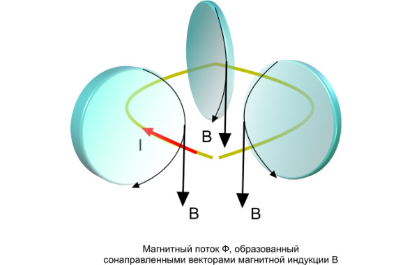 Набор одинаково направленных векторов магнитной индукции, распределенный по некоторой области пространства, называется магнитным потоком Ф. Магнитные потоки различных полей могут взаимодействовать между собой в соответствии с их направлением.