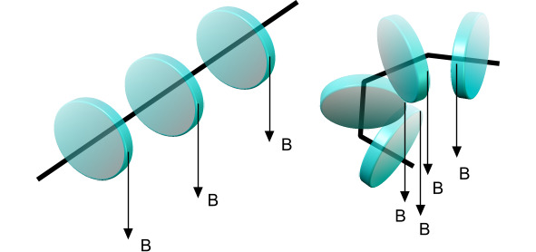 Рис. 4 Повышение концентрации векторов B в центре изгиба проводника