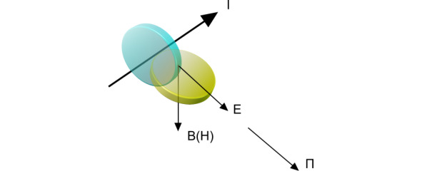 Вектор напряженности электрического поля перпендикулярен вектору напряженности магнитного поля. Вектор Умова-Пойнтинга П, равный векторному произведению векторов электрической напряженности E и магнитной напряженности H, показывает количество энергии и направление распространения электромагнитного поля.