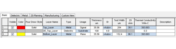 Толщина верхнего и нижнего слоя металлизации равна 35 мкм. Толщина слоя диэлектрика равна 100 мкм. Верхний слой TOP является сигнальным слоем. Нижний слой Bottom является опорным слоем.