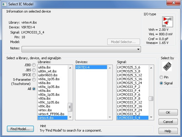 При работе в среде HyperLynx будут использоваться IBIS модели КМОП драйвера и передатчика микросхемы FPGA Virtex-4 с наименованиями LVCMOS33_S_4.IBS, LVCMOS33_S_12.IBS, LVCMOS33_S_24.IBS (отличия в цифрах означают различный ток драйвера от 4 до 24 мА соответственно) если не указаны другие модели.
