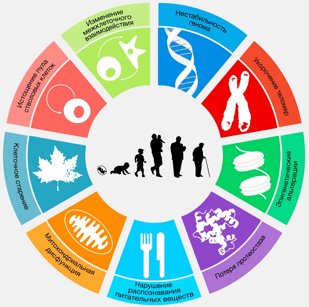 На рисунке показано, какие молекулярные и клеточные механизмы вносят вклад в старение и умирание.
