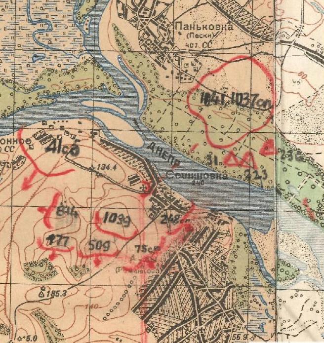 Переправишиеся на правый берег бойцы 6 ср под командованием лейтенанта Сазоева сбив БО противника в районе леса северо-западнее Сошиновки к 6-00 26.09 вышли в район 2 км юго-западнее Сошиновка в направлении высоты 185,3 м.