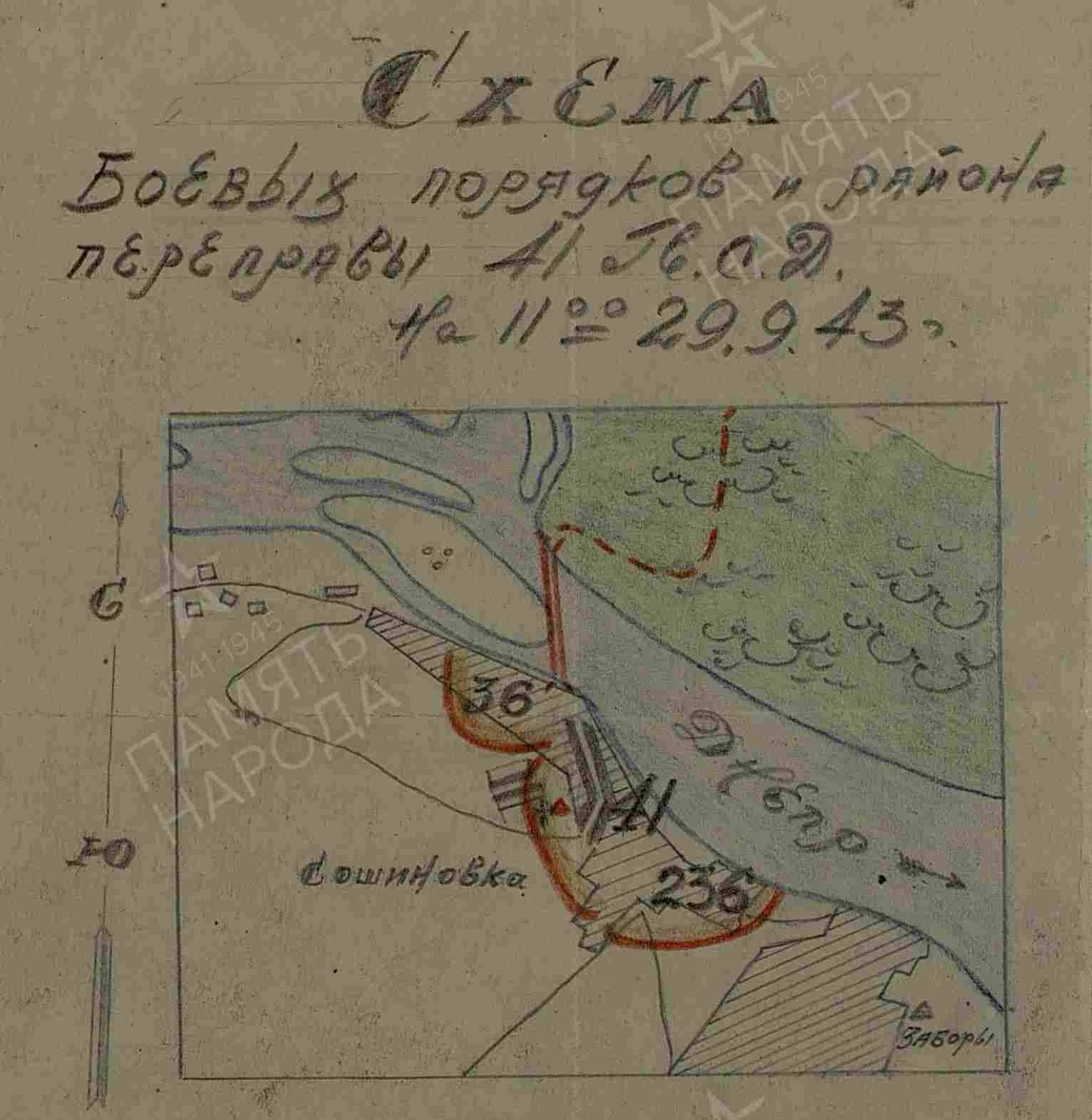 Посмотрите на схему боевых порядков 41 СД на 29.09 (рис. 5) [4]. На ней видно и положение 236 СД на южной окраине Сошиновки. Показано и место переправы.