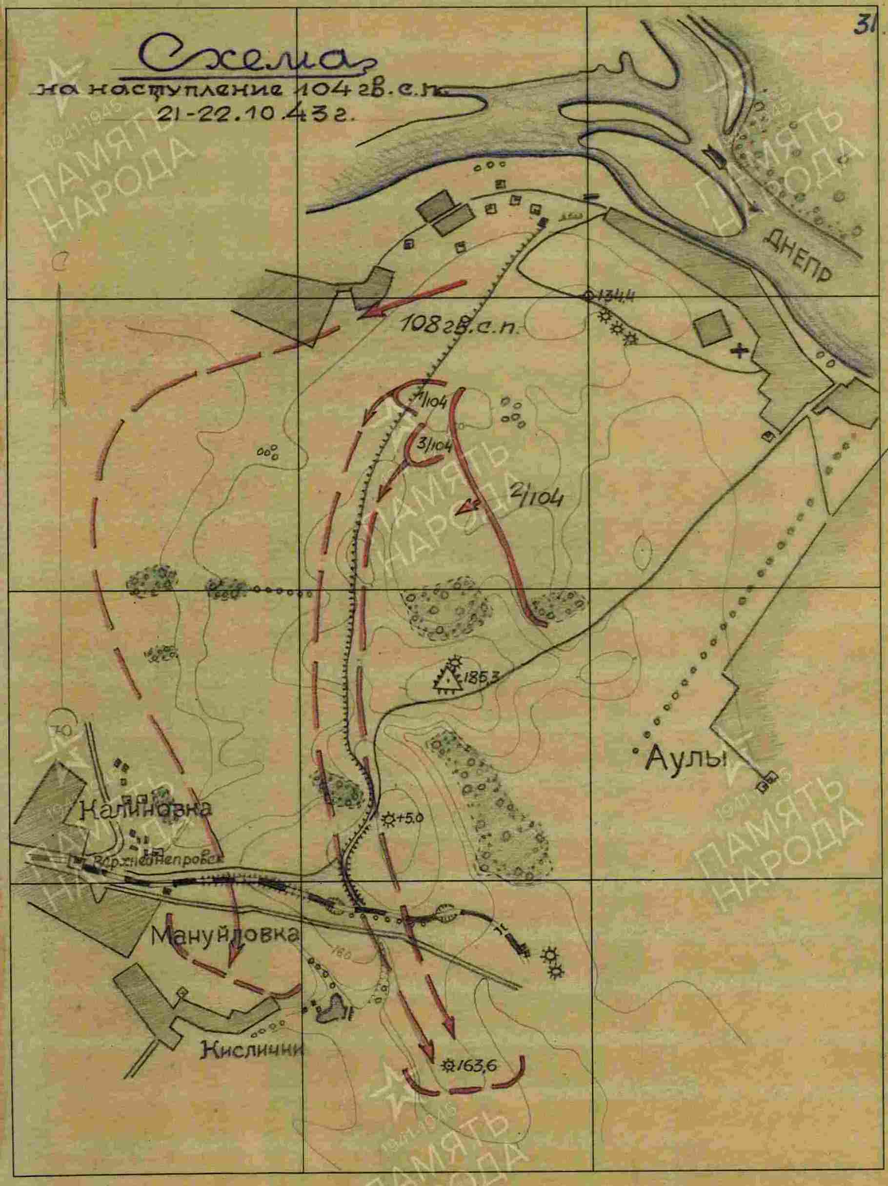 Рис. 8 Схема наступления 104 СП 36 СД на 21–22.10.43 г.