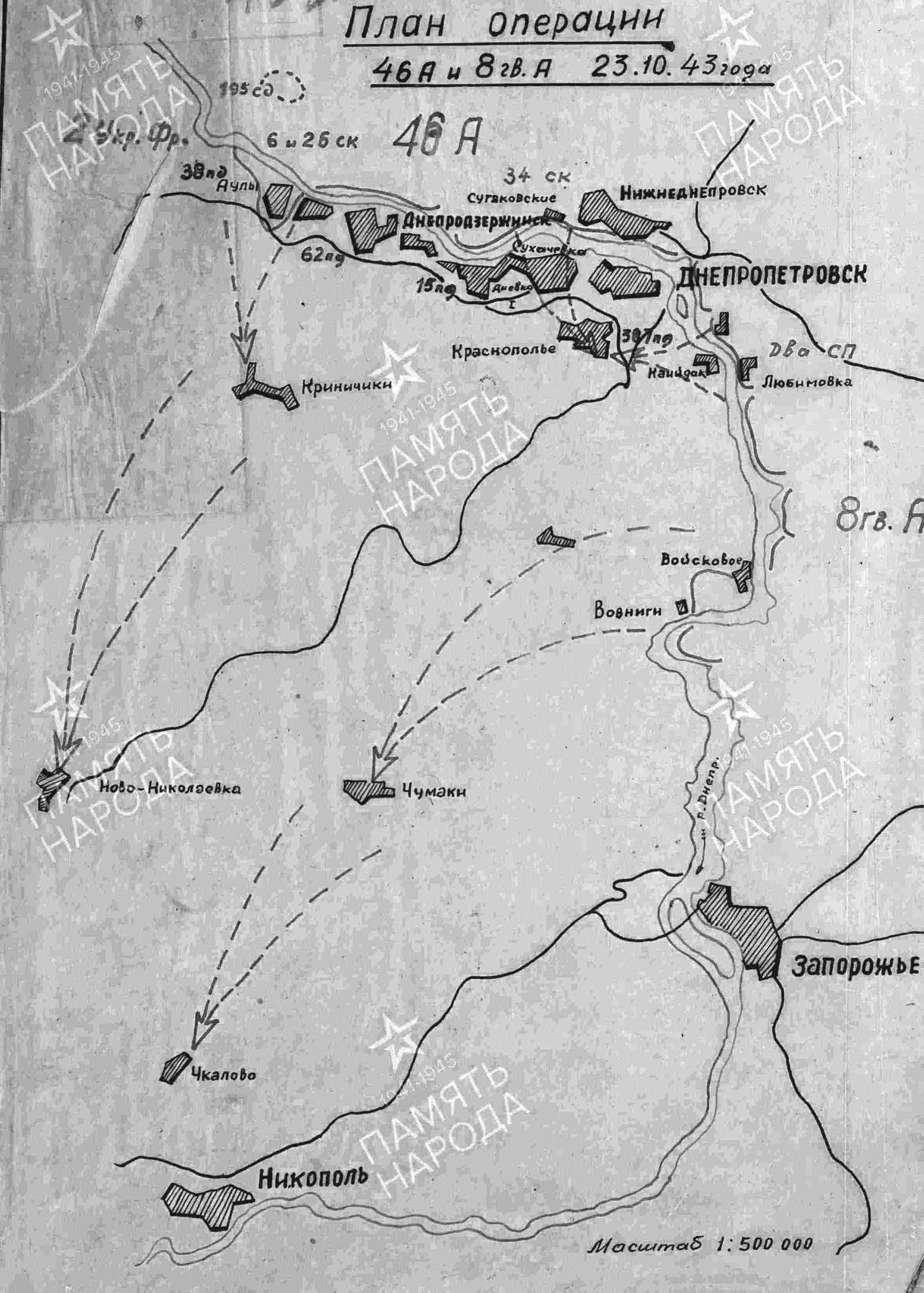 Представляю Вам вырезку из документа «Краткое описание операции 8 гвардейской и 46 армий 3 Украинского фронта по захвату Днепродзержинска и Днепропетровска в октябре 1943 года» [19]: