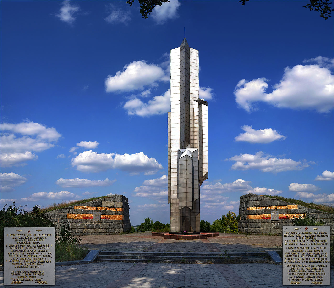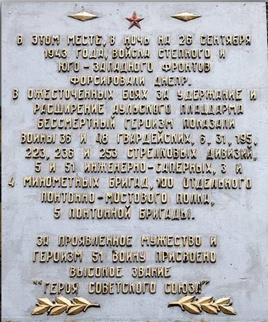 Прочитав мемориальную доску, можно заметить, что 41 и 303 дивизии 57 А вообще не упоминаются, а упомянутая на доске 48 СД из 7 А участвовала одним артиллерийским полком только во время форсирования. И войска Юго-западного фронта участия в форсировании не принимали, а только расширяли плацдарм, когда 46 А передали обратно Малиновскому Р.Я. Так что и к табличкам надо подходить критически.