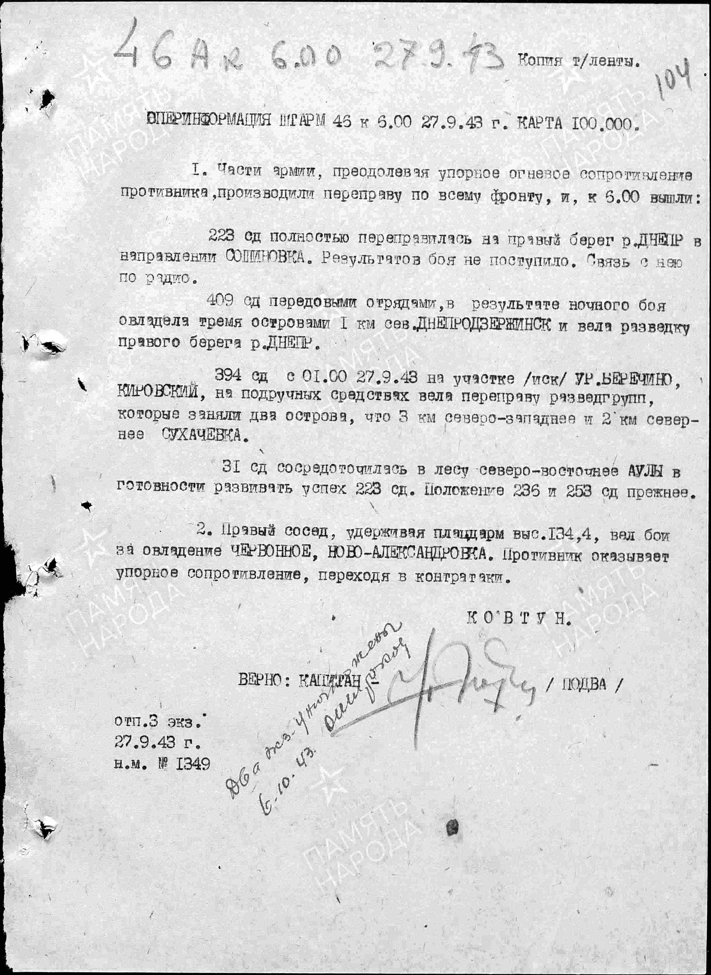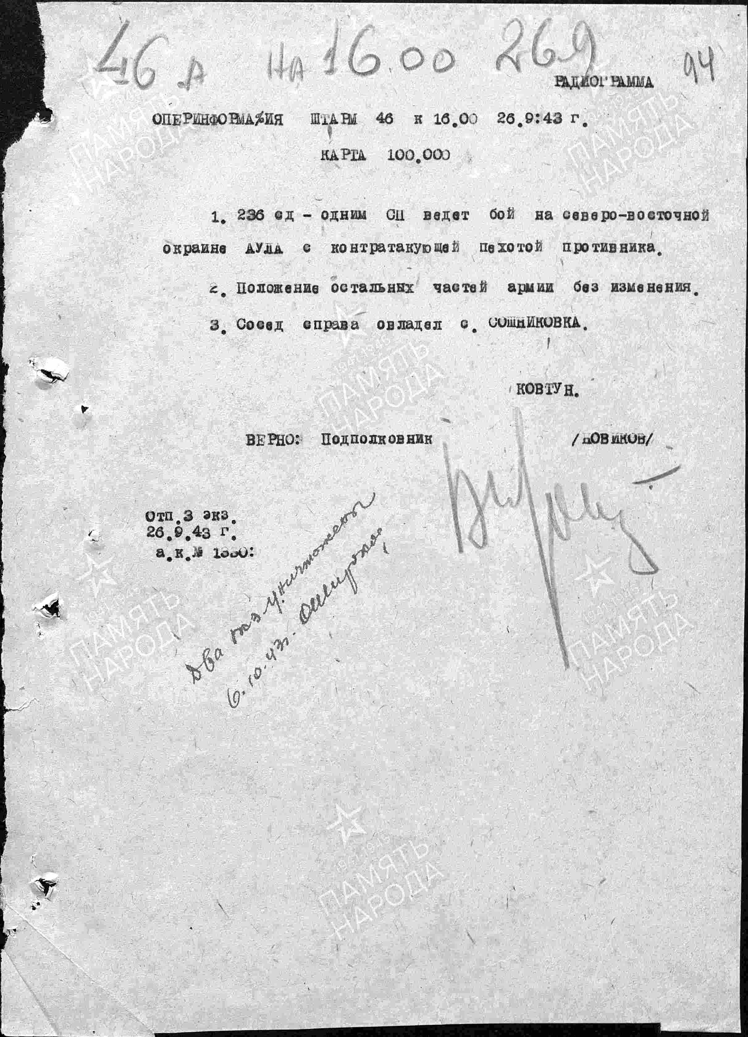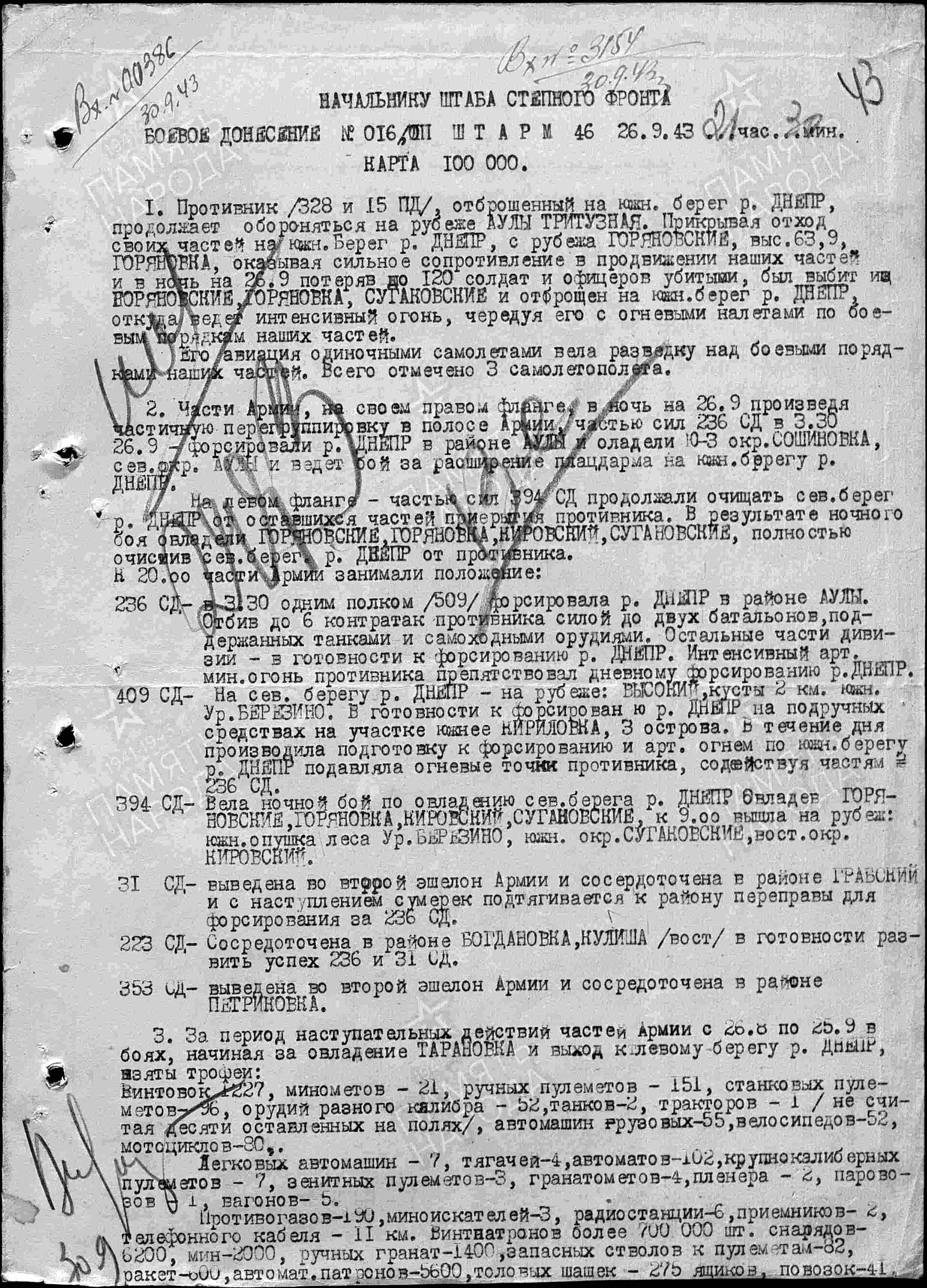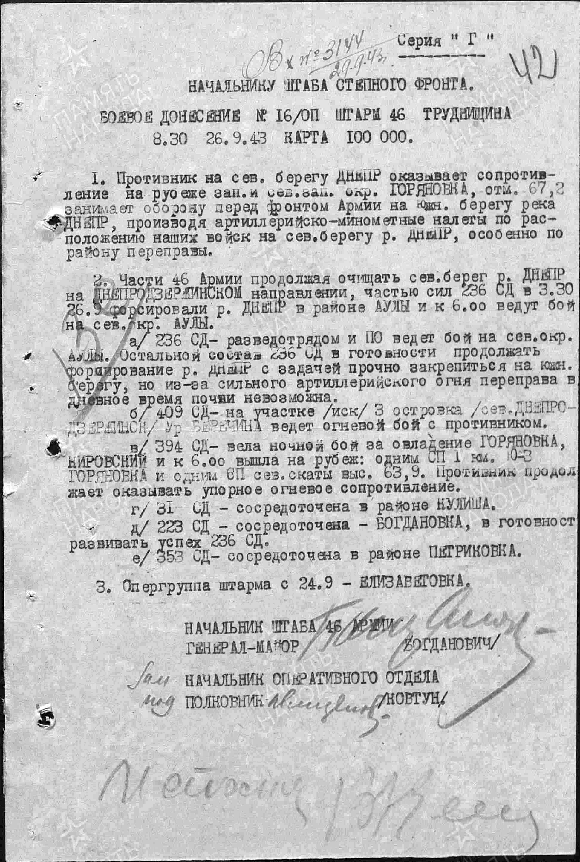 d20. Боевое донесение 46 А № 16/оп 26.09.43 от 8-30 утра.