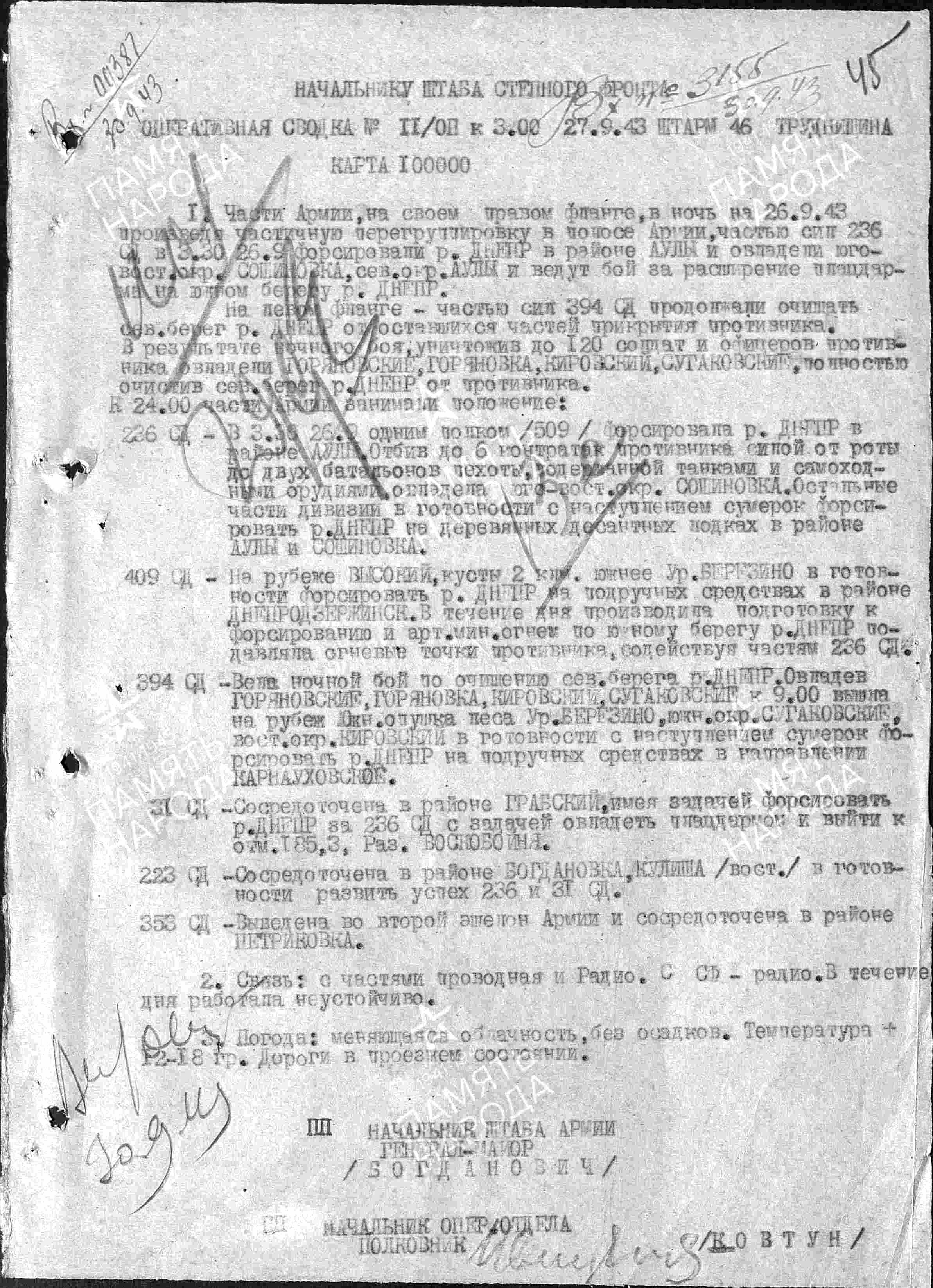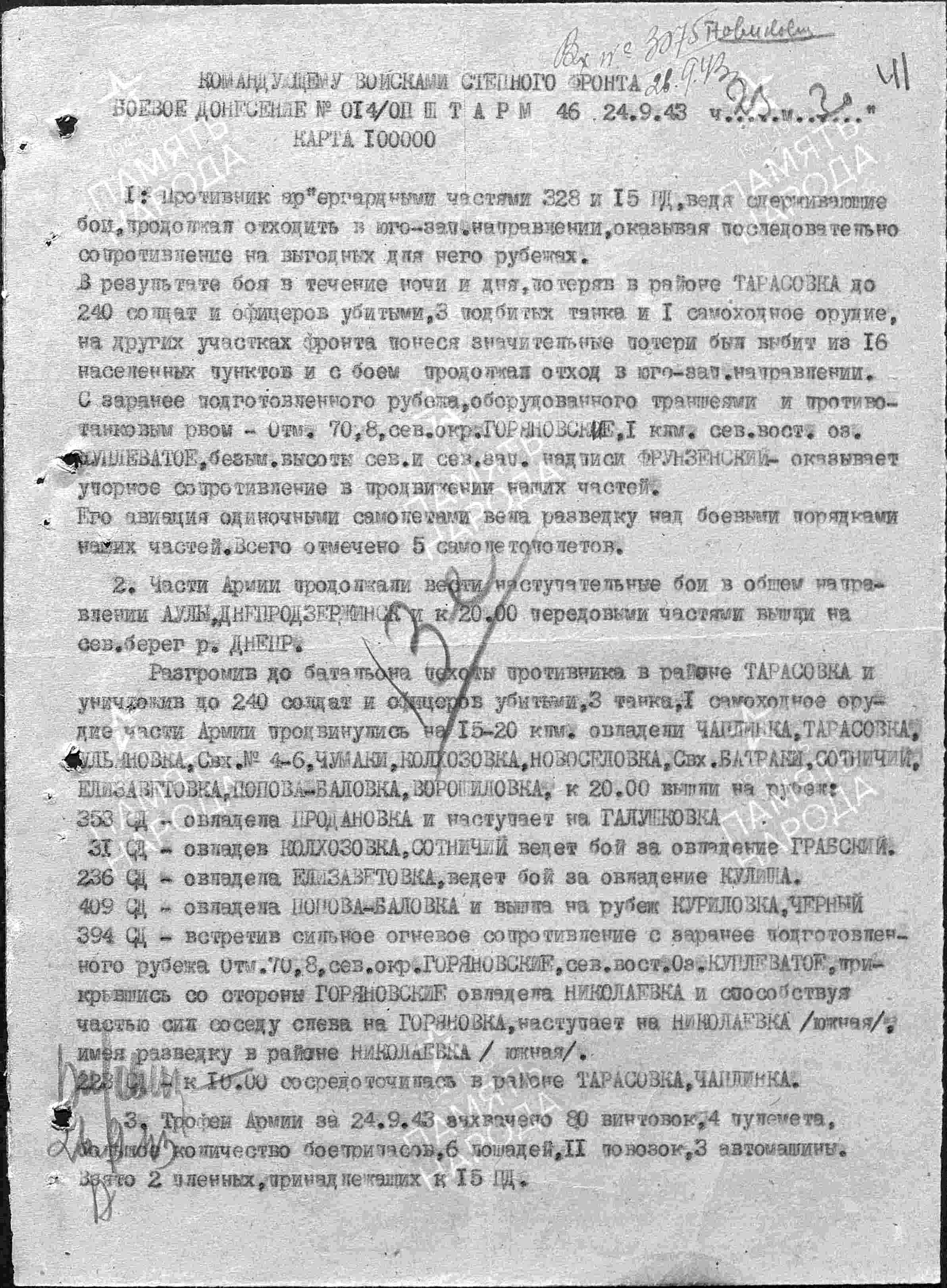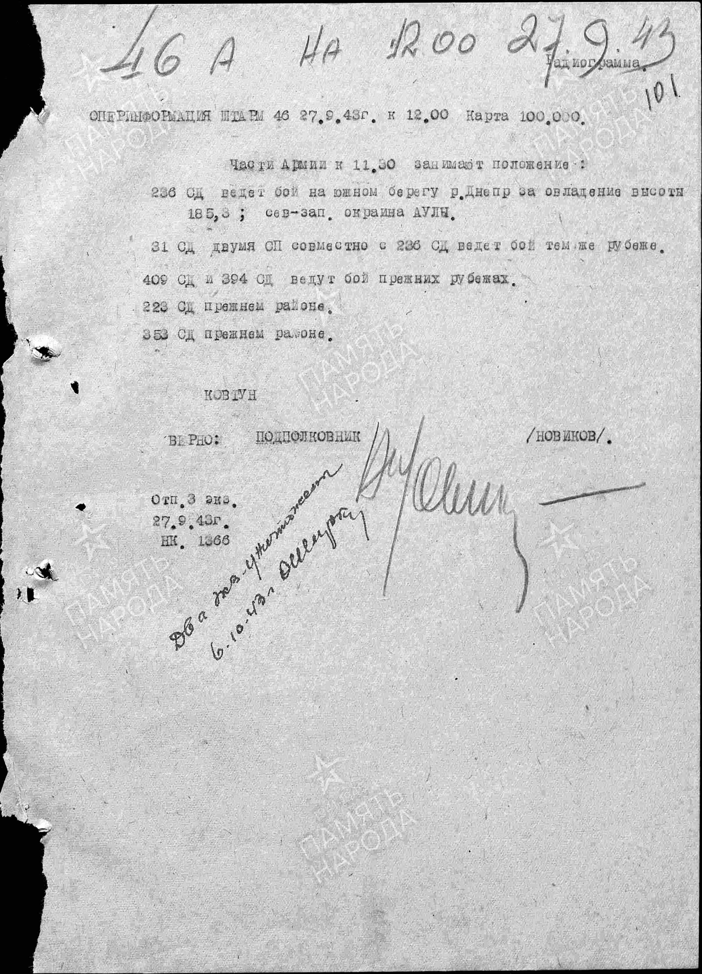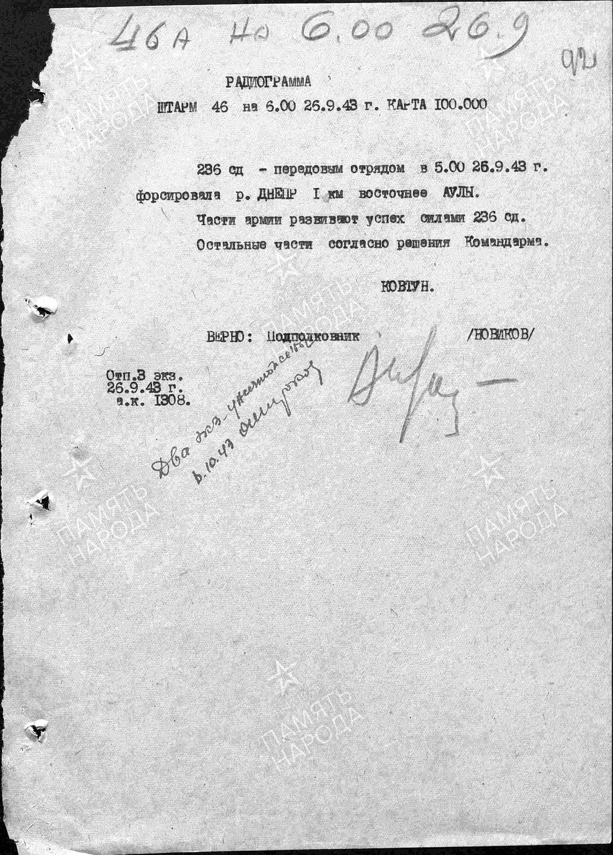 d20. Боевое донесение 46 А № 16/оп 26.09.43 от 8-30 утра.