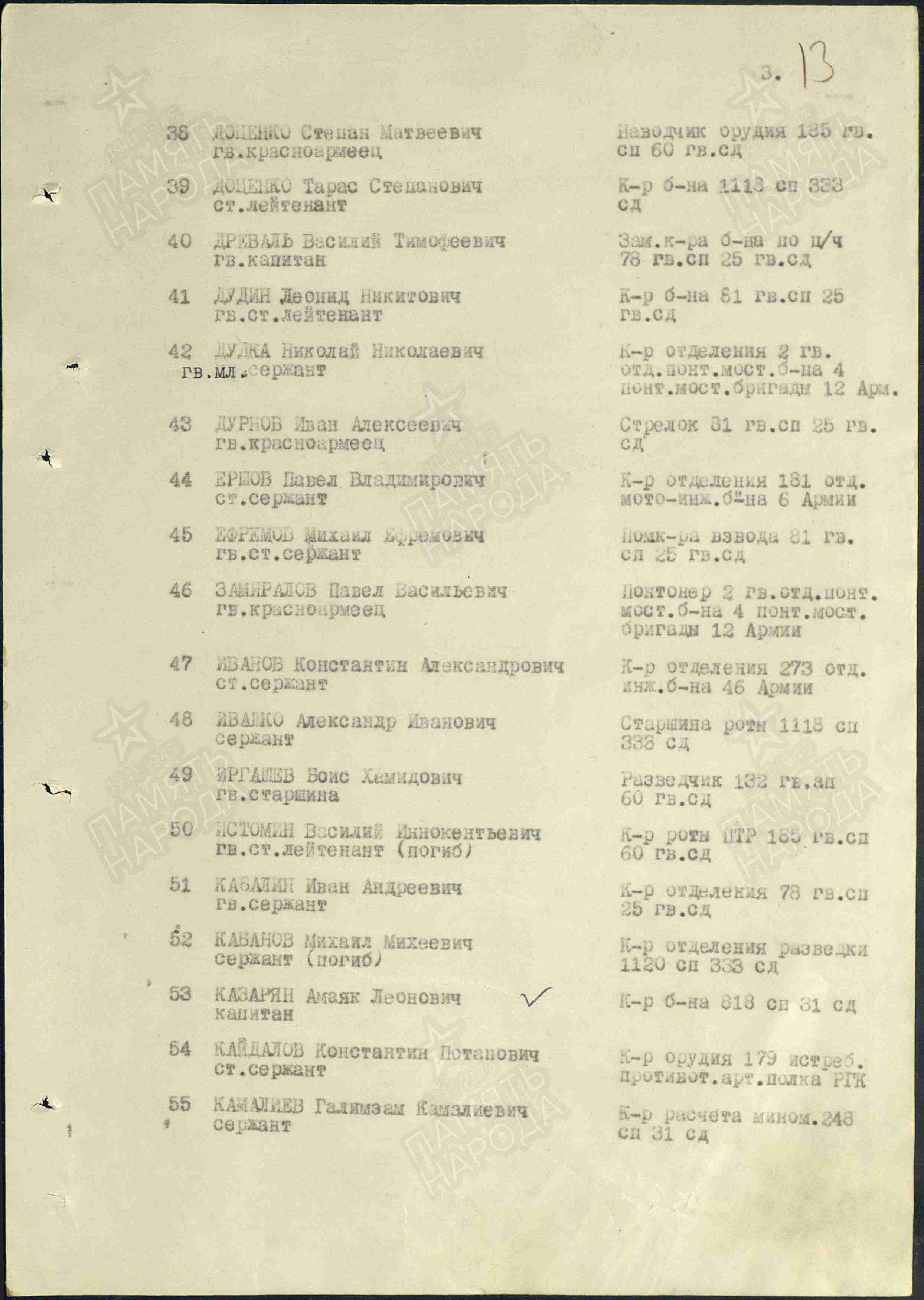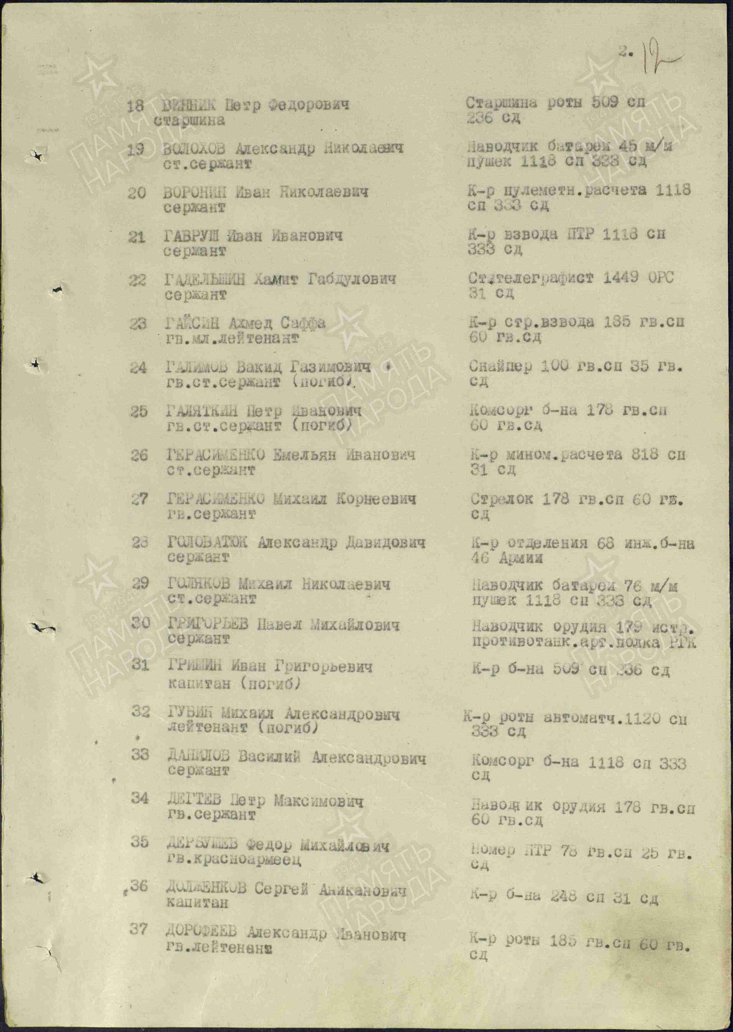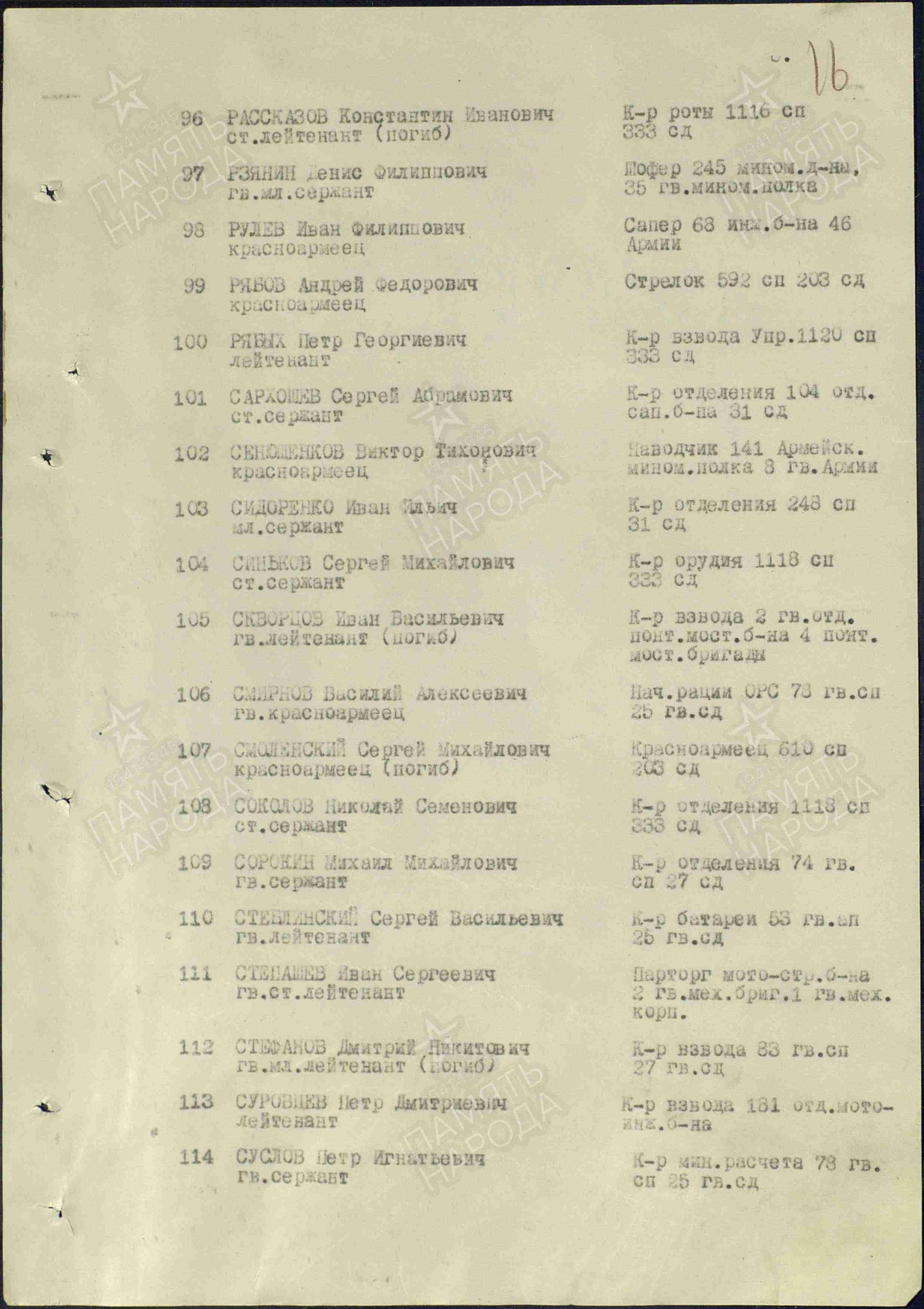 Первыми из передового отряда переправилась 6 стрелковая рота лейтенанта Сазоева. У высоты 185.3 Сазоев 27.09 пропал без вести вместе со всей ротой. Какова их судьба? Сазоев посмертно был награжден орденом Красного Знамени. Почему его не представили к званию ГСС? Почему не получил ГСС командир минометной роты капитан Гронин? В журнале боевых действий 509 СП несколько раз был отмечен героизм Сазоева и Гронина.