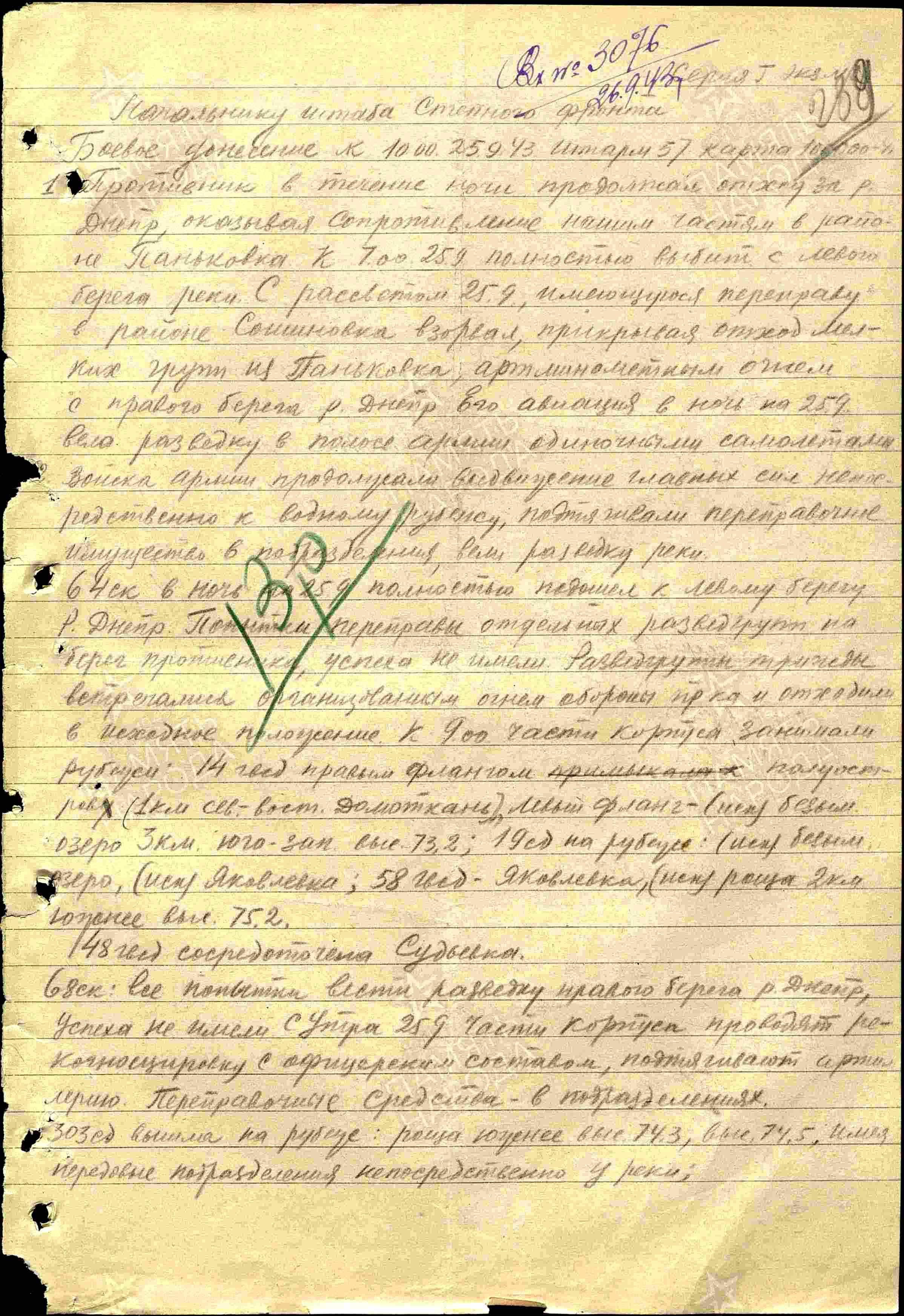 5. Боевое донесение штаба 57 А 25.09.43 г. на 10-00