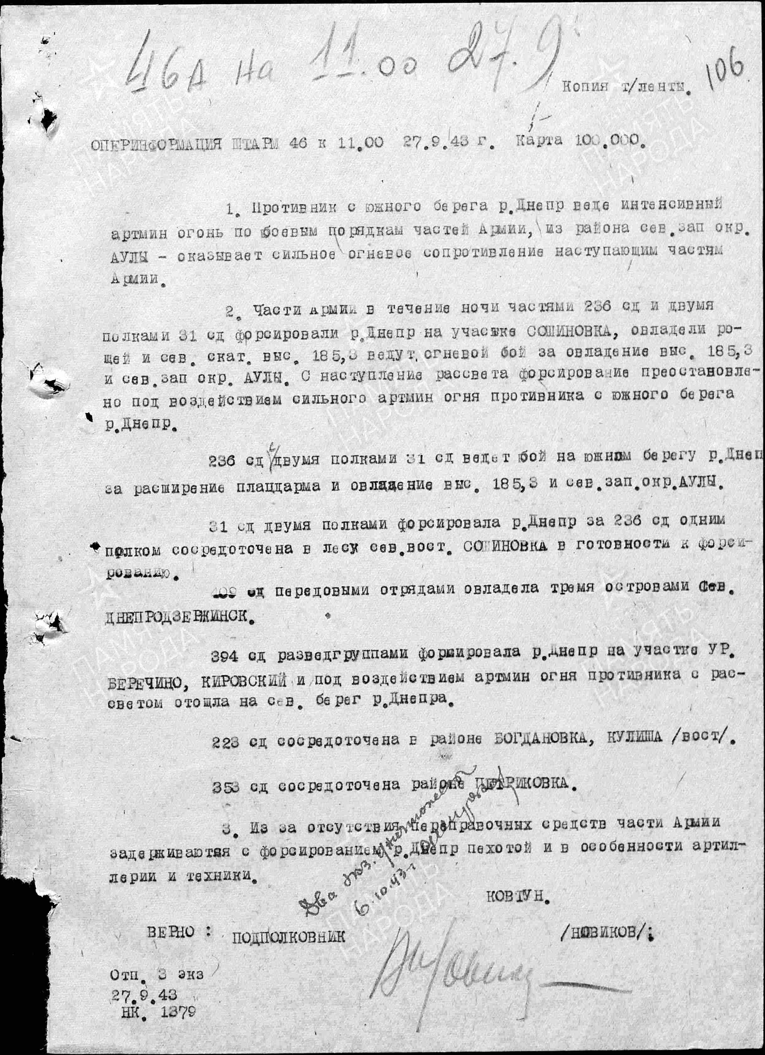 d6. Оперативная информация штаба 46 А к 6-00 27.09.43 г.