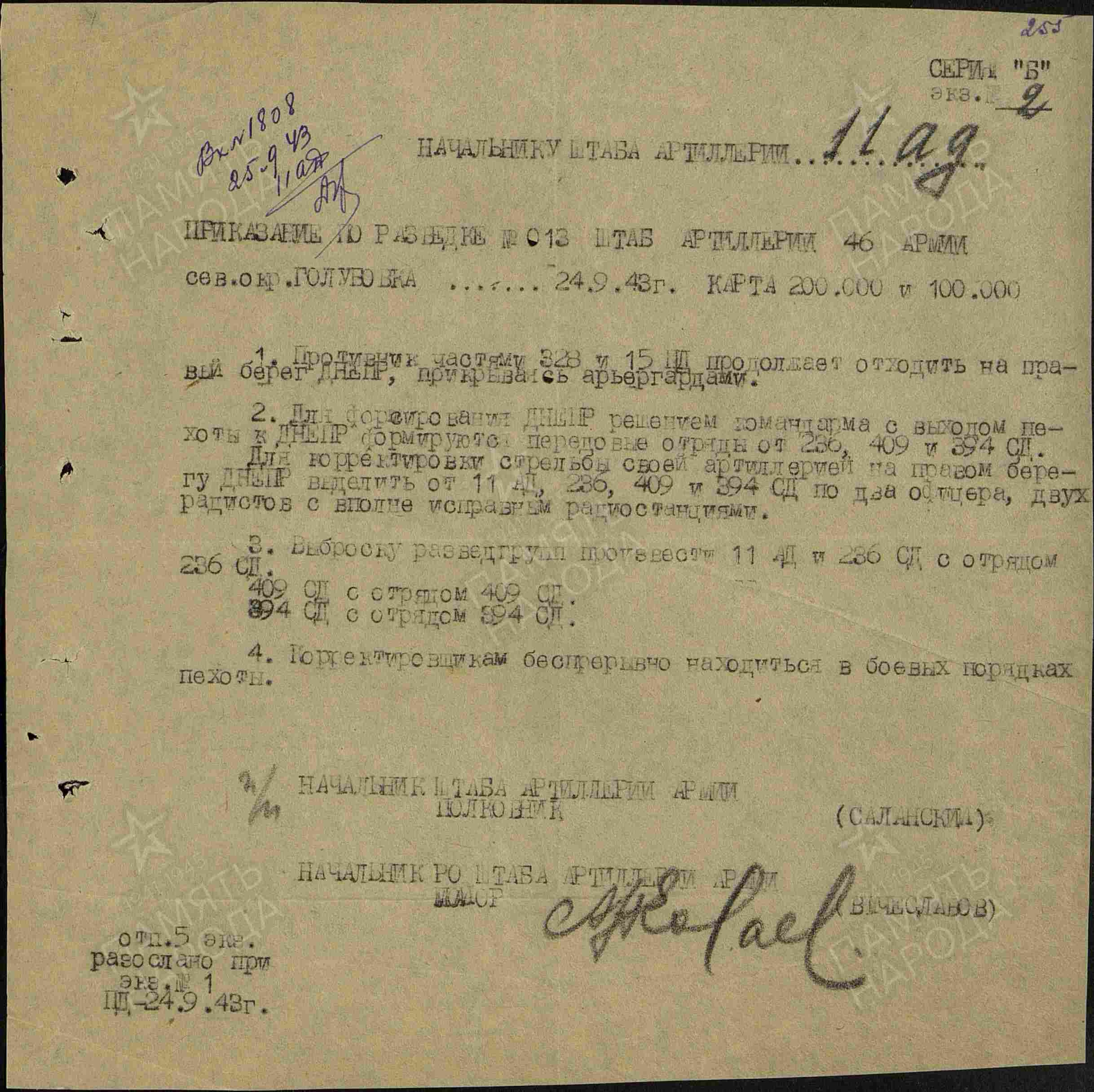 13. Приказ начальника штаба артиллерии 46 А по разведке № 013 от 24.09.43 г.,