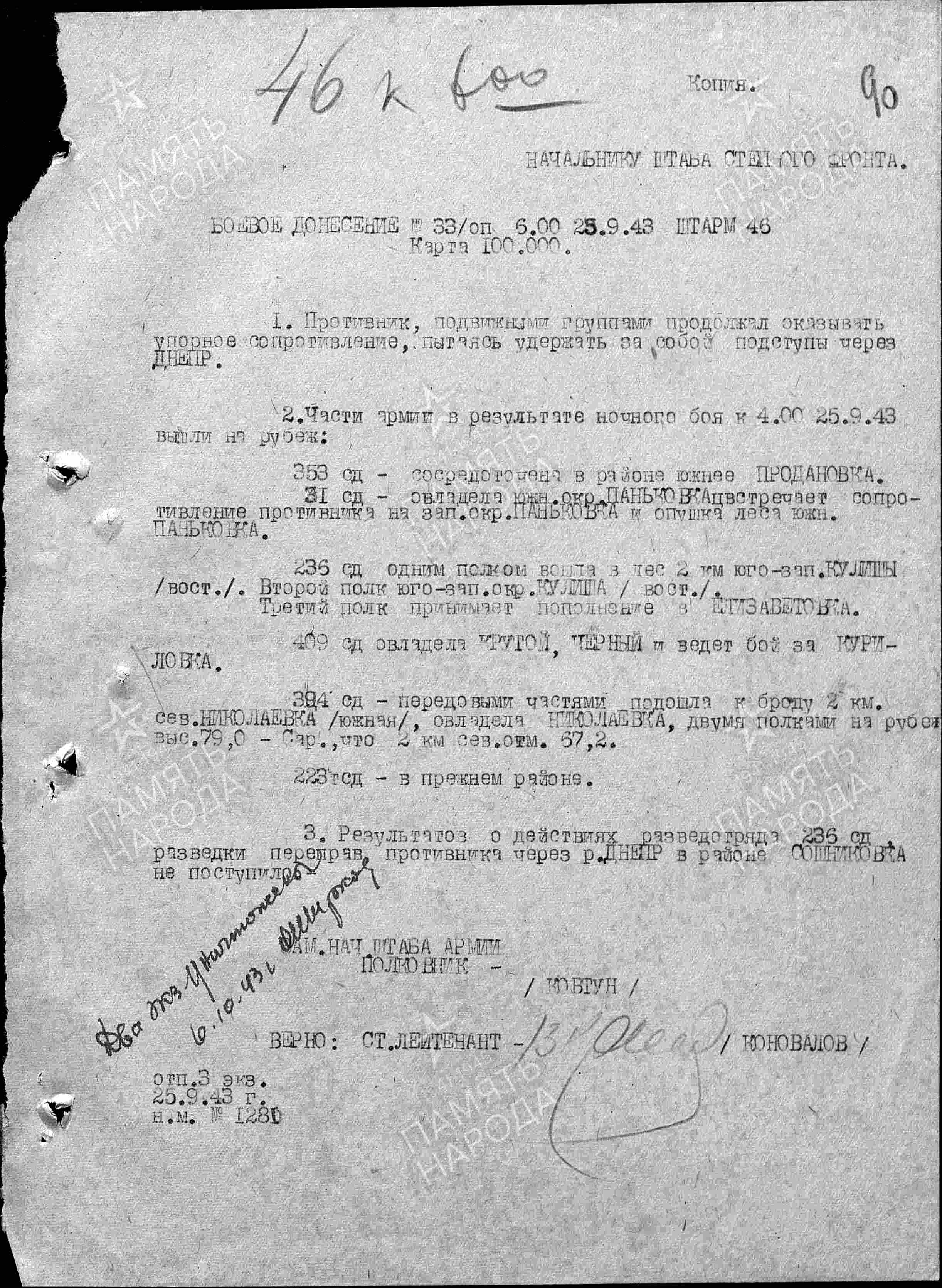d18. Боевое донесение № 33/оп ШТАРМа 46А от 25.09 от 06–00.