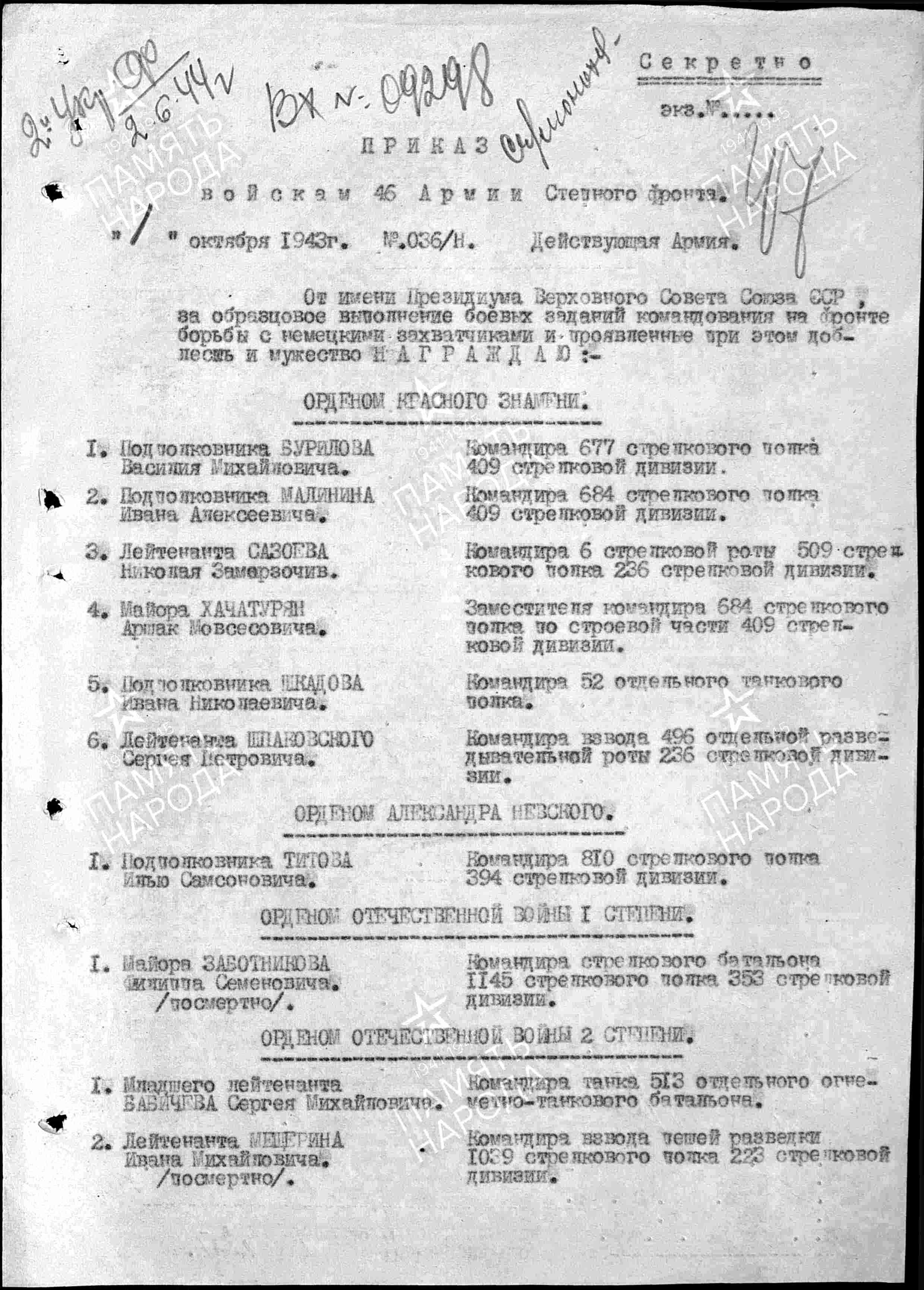 d 40 Приказ войскам 46 Армии Степного фронта № 036/н от 01.10.1943 года