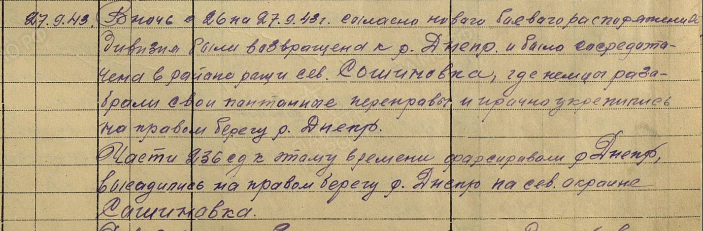 36 СД 57 А начала переправляться в 24–00 25.09 и первой захватила Сошиновку, а 236 СД 46 А переправлялась в полосе 57 А напротив церкви Сошиновки в 400 метрах ниже по течению после 3-30 26.09.