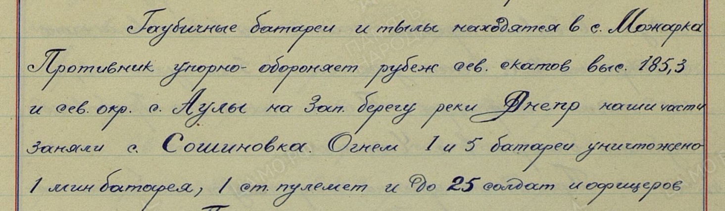 В результате боев (в ночь с 25 на 26.09) освободили Сошиновку и Червоное? Тут явные фантазии автора. Тем более, что Червонное и Сошиновка вообще были в полосе наступления 57 А.