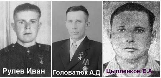 Указом Президиума Верховного Совета СССР от 22 февраля 1944 года за мужество и героизм, проявленные при форсировании Днепра, красноармейцу Рулёву Ивану Филипповичу, старшему лейтенанту Цыплёнкову Евгению Андреевичу и сержанту Головатюку Александру Давыдовичу было присвоено звание Героя Советского Союза с вручением ордена Ленина и медали «Золотая Звезда». Три Героя получили высокую награду Родины за форсирование Днепра на Сошиновском плацдарме.